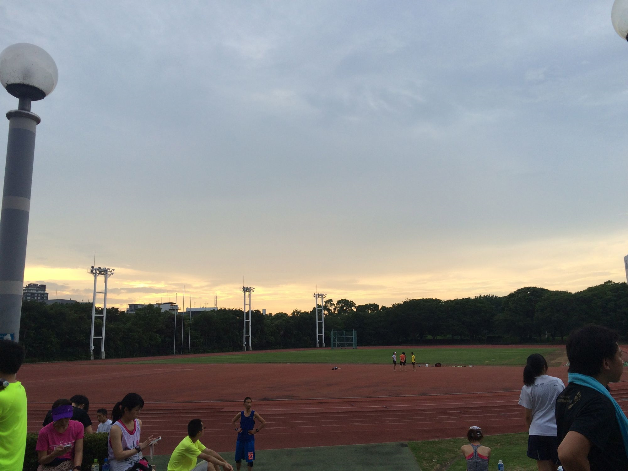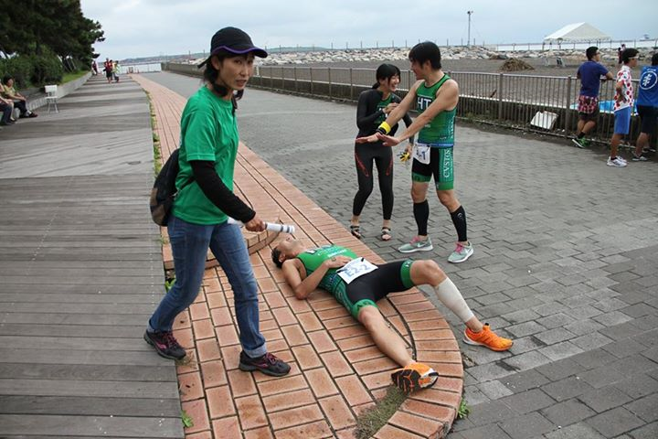 さーて、最後は私の番になるわけですが、ちょっと戸惑ったのが、はっきりスタート時間が決まってるわけではないので、アップをするタイミングがなかなか掴みづらいということ。とはいえスイム前には心拍上げときたいですしねー。最初はこまめにダッシュとかやっていたんですが、次走者のつもりで待っていると四十数分というのは意外に長くて、逆に疲れそうなんでやめてしまいました。んでじーっとしていたのですが、なんだか心拍が落ちない。なるほど駅伝だと始終気分的にドキドキしているんで、運動とは関係無く心拍があがっちゃってるんですね。これってアップいらなくね?なんて調子こいていると、向こうから緑の初トラスーツに身を包んだ吉岡さんがグングン近づいてきました。吉岡さんがこちらにタスキ(といっても足首の計測バンドですが)を渡すため、最後の力をふりしぼって全力疾走です。おお、これは滾るぞ!