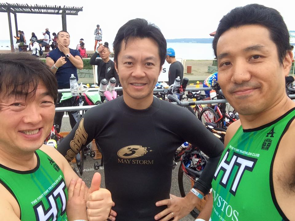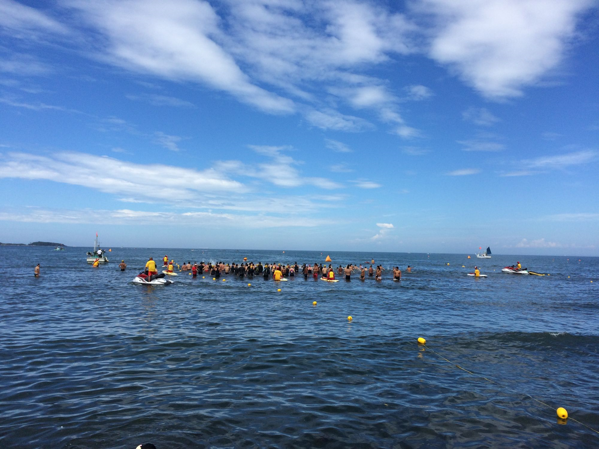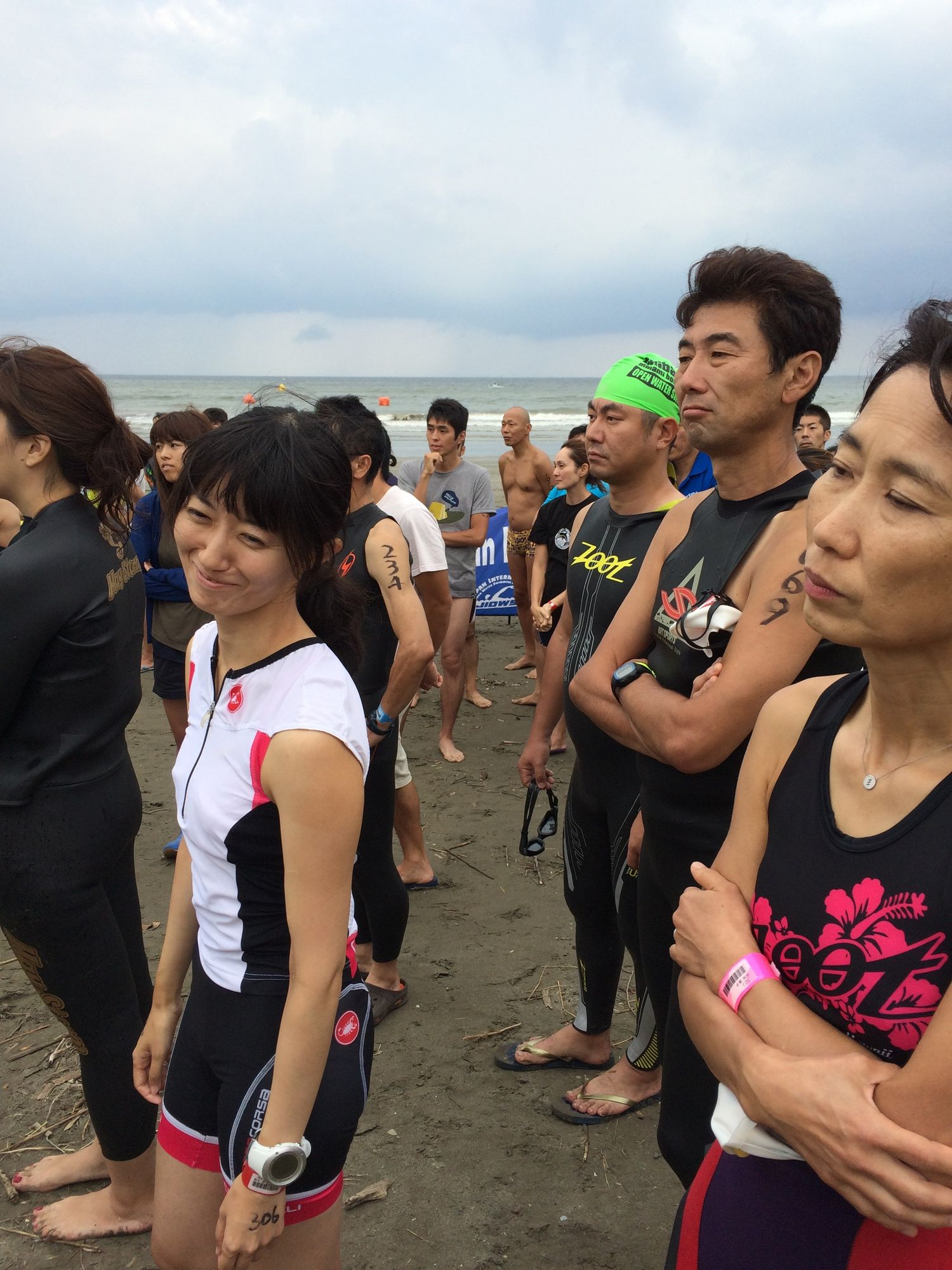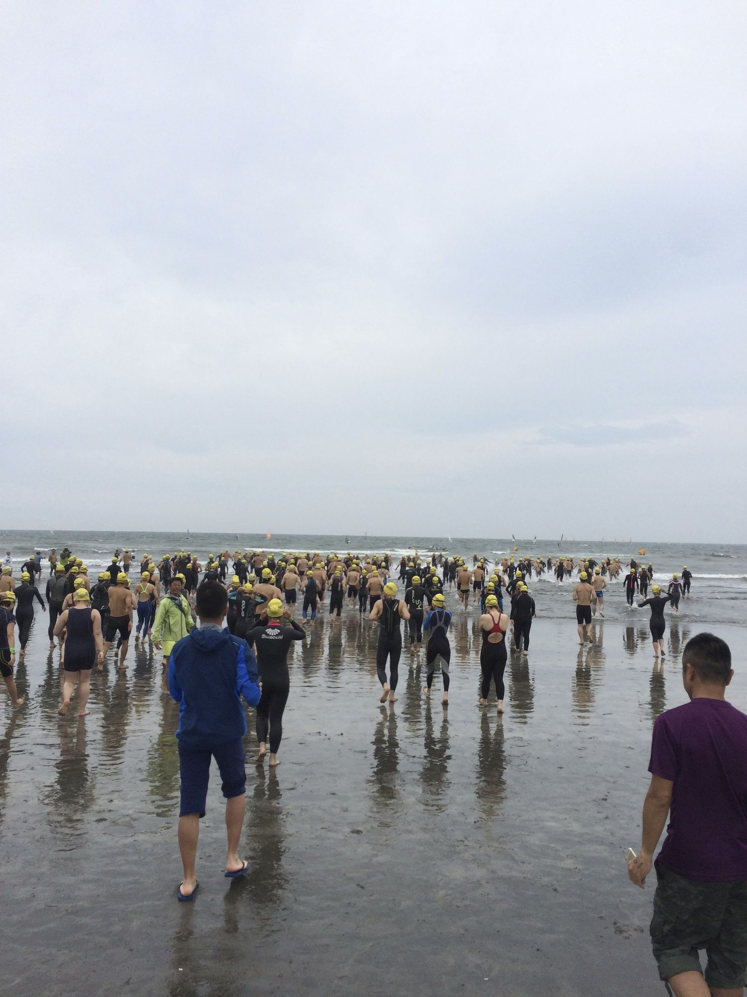そんなこんなでバタバタしている間に、いよいよレースがスタートとなりました。といっても第3走者の私はこの時点ではまだ観客ですけどね。駅伝も一般のスーパースプリントに混じっての出走なので、いつも見慣れた激しいスタート争いが繰り広げられます。だけれどたった350mですからねー。あっという間に終わっちゃうんですよ。速い人は4分ちょっとでスイムアップしてしまうので、見てる側もけっこう慌ただしいです。スイムアップ地点までダッシュで移動して応援ですわ。トランジットも無駄な動きがなくて早い早い。佐渡のトランジットではゆっくりトイレに身支度を調えて、ういろうのどに詰まらせたりしてたのに、そんなのどかさはここには一切ありません。みなさん乗車線までバイクつかんでフルダッシュ。次から次へとスタートを切っていきます。一分一秒すら無駄にしない心構えを感じさせます。でもまあ、観客的にはようやくここで一息つける感じですかね。
