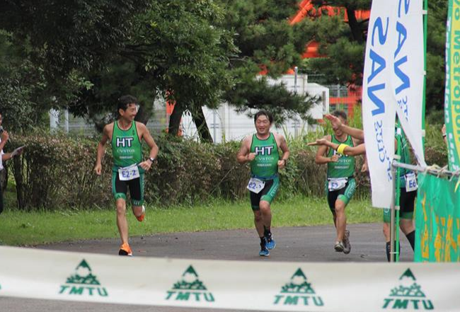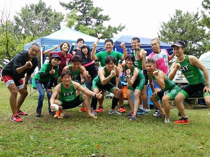 最後はラン。海浜公園内を廻るコースを1周するんですが、こちらもなんだかコースが複雑。そしてまたしても孤独です。出だしこそキロ4分を切るペースで飛ばせましたが、なんぞ?この海辺の公園を爽やかにジョギングしているようなシチュエーション?やっぱり競り合う相手がいないと怠け心が顔を出してきて、ぜんぜんペースが維持できません。応援も殆ど無いからどうやって気分を盛り上げたものか……なんて悩んでも、2.5キロだから考えている間に競技が終わっちゃいそうです。気持ちだけ焦って走っていると、はたと後方に人の気配がして振り返りました。見ると20秒ぐらい後方に、なんだか走っている選手がいます。さっきまで誰もいなかったのにいきなりそこに現れたということは、ひょっとしていいペースで追い上げられてる?見てる間にもぐんぐん迫ってくる感じです。ヤ・バ・イ!!さすがに頭のどこかでカチンとスイッチの入った音がしました。いきなりエンジン全開!あれ、こんな余力があったの?ってぐらいにペースアップはしたんですが、後ろの人のペースがよくわかりません。ちらと確認すると、近づいてはいないような、でもピッタリ食いつかれているようなー。なんにしても、さすがにこんな終盤で順位落としたら吉々さんたちに申し訳ないったらありません。カミサマ、競争相手がいないとモチベがあがらないなんて舐めたこと言ってスミマセんでした!必死で腕振って脚回していると、近づいてくる電波塔みたいな建物。あの脇のコーナーを抜けるとゴールゲートです。なんとかあそこまでなんとか頑張らないとー!!!ラストスパートをかけていると、コーナーのあたりに緑のユニフォームを着た人たちが何人か、こちらに手を振っているのが見えました。ゴール前の出迎えにきてくれた初トラの人たちです。もちろん吉々さんたちの姿も。横を通り過ぎると一緒に走りだしたんで、ああファミリーゴールをするのか!とは思ったんですが、なんか朗らかな走りっぷりの吉村さんと吉岡さん。でも後ろが気になってスピードが落とせない私!吉々さんたちも止まらない私に、怪訝そうな顔をしながらもペースアップ。おいおいおいおい!おおよそファミリーゴールとは思えない様相で、全力疾走でゴールイン!となってしまいました。勘弁してください。怖かったんですぅ(T_T)