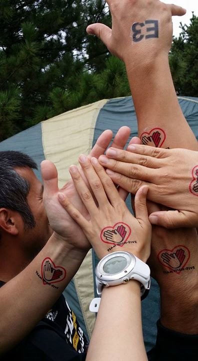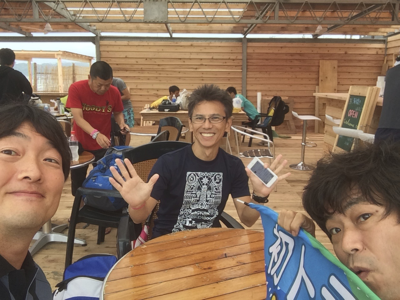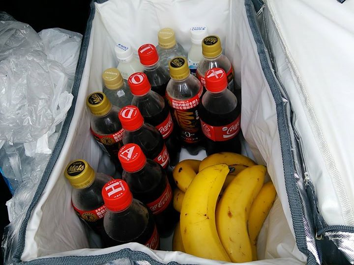 まあそんなガチな皆さんに囲まれて今更ジタバタしても仕方がないので、我々はカミヤさんが持ってきたボディーステッカーで気分だけパワーアップ!ゼッケンのステッカーの他にも、ニコトラ(応援をしてくれた人に笑顔を返そうっていう呼びかけ)の一環で作ったTEAM HIGH FIVE(ハイタッチ)のステッカーをたくさん持ってきてくれたので、かなり気分はアゲアゲになりました。さらにバナーナとコークをたくさん持ってみんなの応援に来てくれた柴崎さんのおかげで、エネルギー的にもパワーアップ!バナーナは大事ですよ。